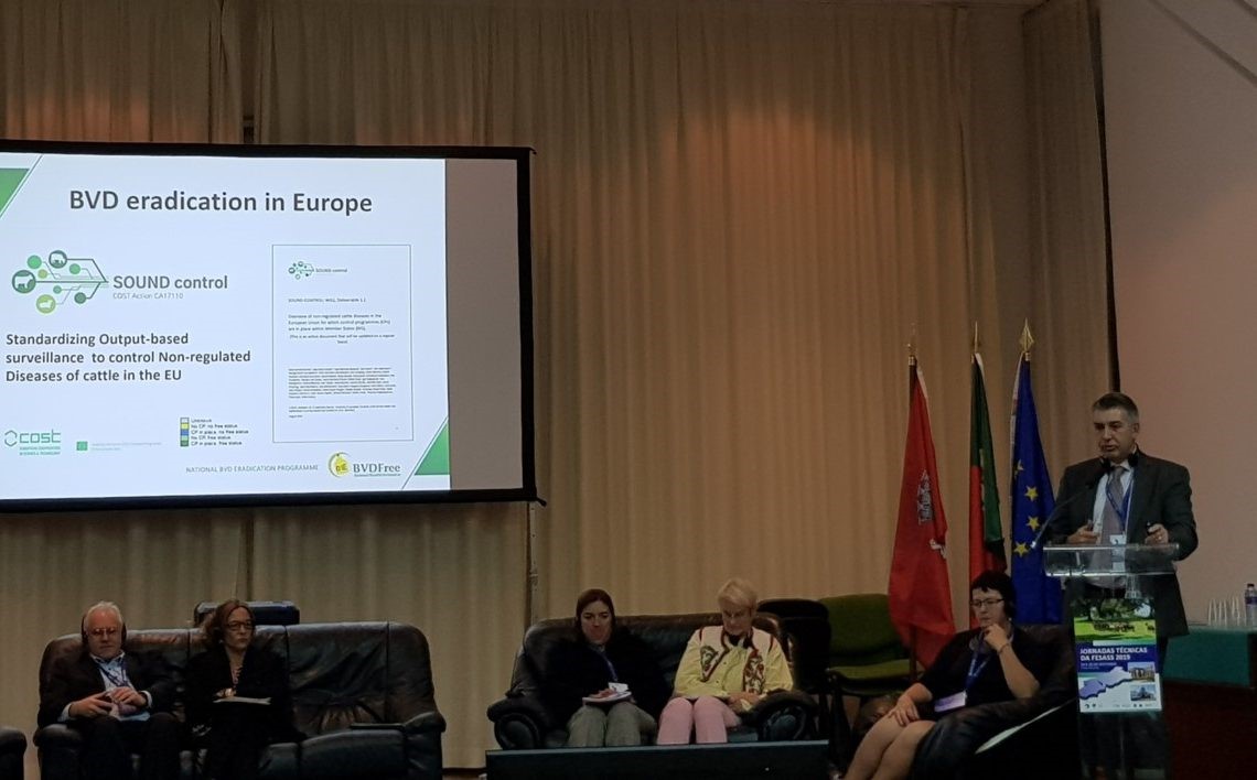 Dr David Graham speaking at the European Federation for Animal Health and Health Security (FESASS) technical days, Friday 25th October 2019, Elvas, Portugal. This meeting focused on the implementation of the Animal Health Law by studying the assets and challenges for farmers and their animal health organisations. Dr David Graham informed the meeting on the STOCfree project and SOUND control COST action as part of his talk: BVD eradication programmes in Europe.